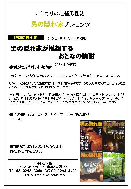 当企画では、「本格焼酎の愉しみ方」を毎日飲める定番酒から幻とされる限定酒までそれぞれのシーンに合わせて愉しみ方を提案致します。今回は特別に1ページと1/2ページの枠をご用意し、雑誌「男の隠れ家」が推奨するお酒として御社商品の魅力を効果的にPRすることが可能です。詳細はぜひお気軽にお問い合わせください!