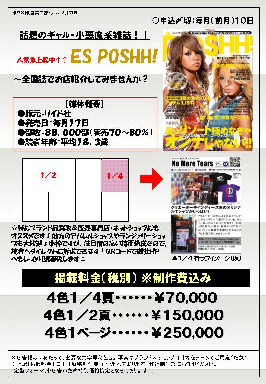 いまちょっとしたブームになっている「ギャル&小悪魔系雑誌☆ES POSHH!」にて、弊社買いきりページでSHOP連合広告企画を実施することとなりました。広告コストをあまりかけずに小枠ではありますが、全国誌に露出することで、色々な側面からメリットを感じて頂ければ思います。QRコード掲載や見やすい誌面でHPへの誘導やお店の魅力的な紹介ができますよ!