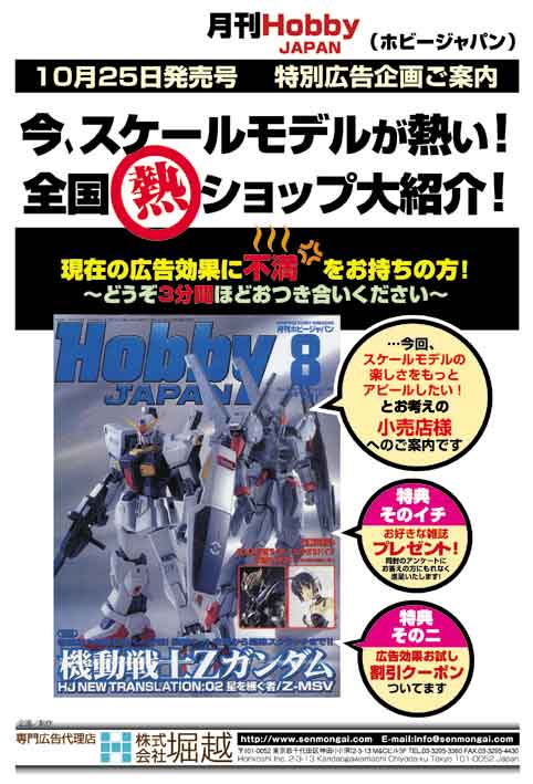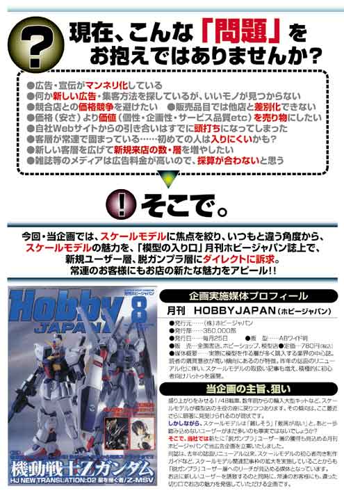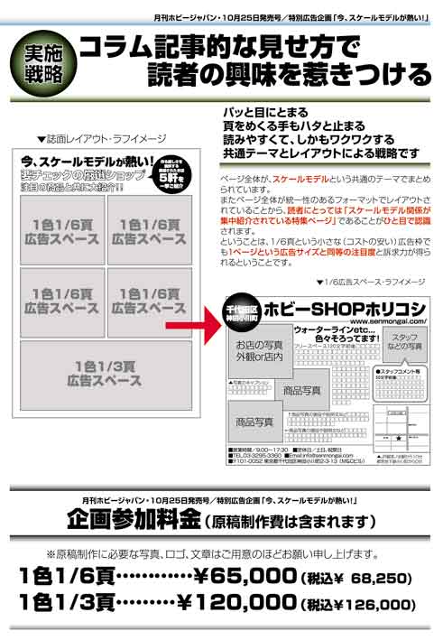 「¥5000引きます!!!」このページをご覧の皆様、はじめまして。この度企画7課に配属されました模型寄り新人、渡邊聡と申します。今回のこの企画は、自分の古巣の模型業界を盛り上げる為に立てさせていただきました企画1号です。このページをご覧になって御参画の皆様!広告効果お試し特典といたしまして、1色1/6¥ 60000(制作費込み)1色1/3¥120000(制作費込み)とさせていただきます。模型業界に一言あるお客様!是非この機会をご利用下さい!!