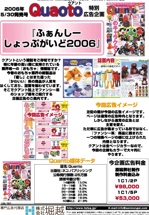 こんにちわ!7課ホビーチームの渡邊です。月刊Quantoにて久しぶりの企画モノをやってみます!テーマは『ファンシー』以外と知られていない事だと思いますが、Quantoは読者に主婦層が多い媒体ですので意外な効果がありますよw