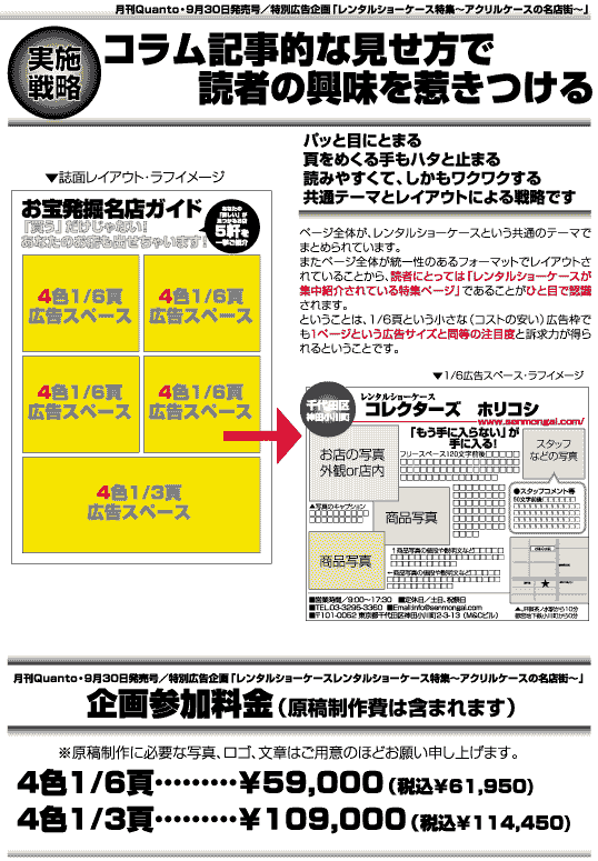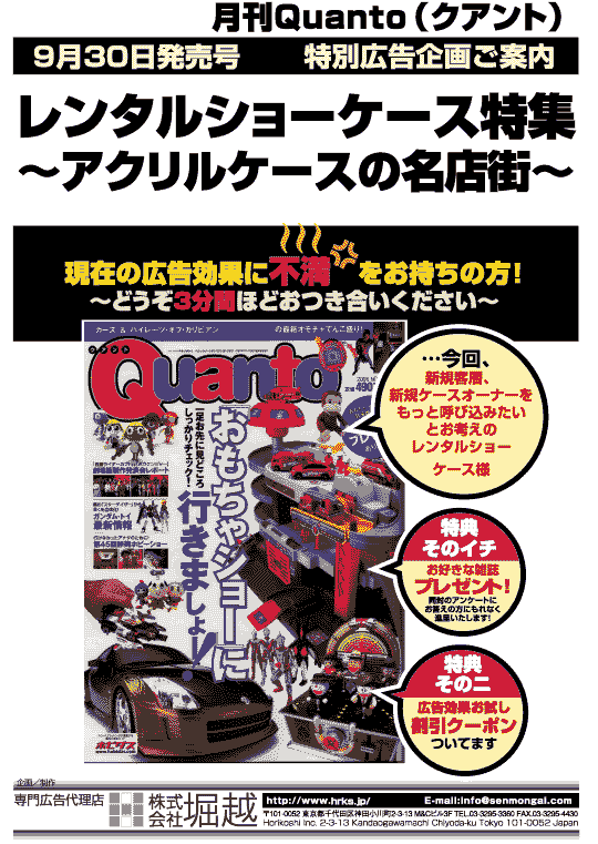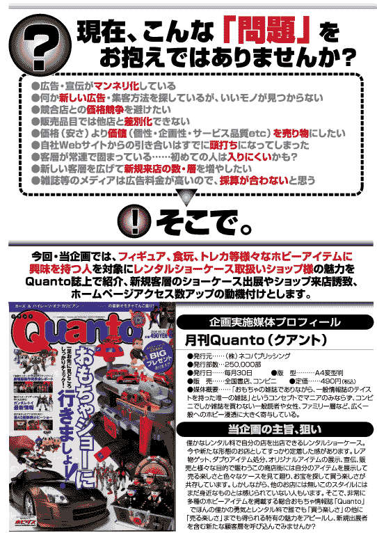 こんにちは!ホビー課の藤原です。 皆さん、「レンタルショーケース」をご存知ですか? …って訊くと「知らない」と仰る方がまだそこそこいらっしゃるんですよねぇ…。 誰でもお店を持つ事が出来たり、レアなブツを手に入れる事も出来るという点こそがレンタルショーケース様だけの大きな魅力! そこで、その独特の魅力を皆さんに知って頂きたくて、今回「Quanto」で企画を立てました! レンタルショーケースで見られるアイテムを広く取り扱う「Quanto」はおもちゃ箱のように魅力的なお店を紹介する媒体としてまさに効果的です!