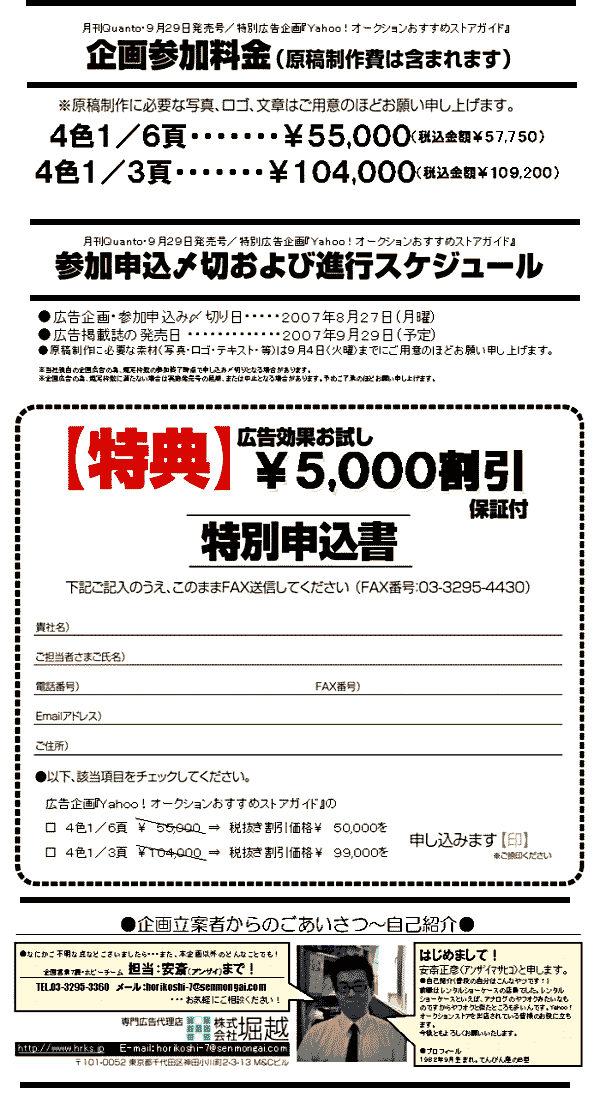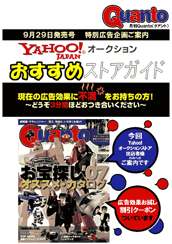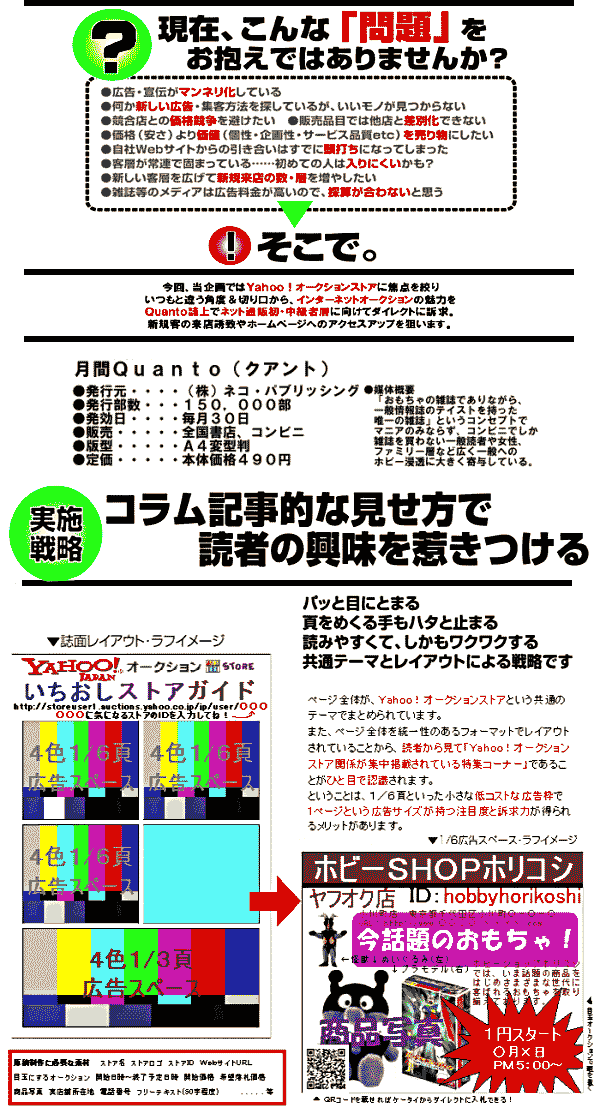 企画実施媒体プロフィール 月刊Quanto (クアント) ●発行元・・・(株)ネコ・パブリッシング ●発行部数・・150,000部 ●発行日・・・毎月30日 ●版型・・・・A4変型判 ●販売・・・・全国書店、コンビニ ●定価・・・・本体価格490円 ●媒体概要・・「おもちゃの雑誌でありながら、一般情報誌のテイストを持った唯一の雑誌」というコンセプトでマニアのみならず、コンビニでしか雑誌を買わない一般読者や女性、ファミリー層など、広く一般へのホビー浸透に大きく寄与している。 当企画の主旨、狙い Yahoo!オークションは出品数1000万点以上、利用者600万人以上をかかえる日本最大規模のインターネットオークションサイトです。 ということはそこでストアを出店されている皆様のほうがよくご存知でしょうか。Yahoo!JAPANの誕生10周年を記念して始まったオークションの利用無料キャンペーンにより、この1年間いまだかつてない盛り上がりをみせたことでしょう。しかし8月7日でそのキャンペーンが終了、イタズラ入札などをするマナーの悪い利用者が減り安堵する一方、お試し感覚でオークションに参加していた善い利用者の落札も減少するおそれがあります。また、家電ドットコム事件やその他のインターネットオークション詐欺が報道される事により、一部の人々にインターネットオークションは怖いと印象づけてしまいました。 そこで今回の企画 Yahoo!オークションおすすめストアガイド に 貴社を Quanto 誌にてご紹介することによって、ストアの知名度をUPさせ、Quanto読者に潜在する善い落札者を固定客としてダイレクトに引き込んでしまいましょう。また、貴社が雑誌に広告を出すことができるオープンな企業という信頼感を読者に持たせ、安心してオークションを楽しんでもらえるようになることでしょう。