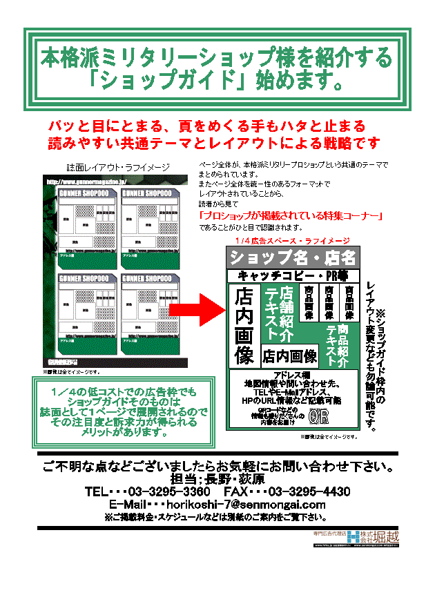 GUNNER VOL.9 ―THE MILITARY DVD MAGAZINE― 広告料金のご案内 概 要 ■誌名:GUNNER VOL.9 (大洋図書刊) ■発売日:2008年 6月11日(水) ■発行部数:20,000部 ■体裁:A4冊子付き DVDマガジン ※VOL.9からプロショップ向けショップガイドを設けました。 ■広告料金表 スペース 定価 サイズ 4c1p \250,000 280×209mm 4c1/2p \150,000 126×194mm (ショップガイド) 4c1/4p \80,000 60×194mm