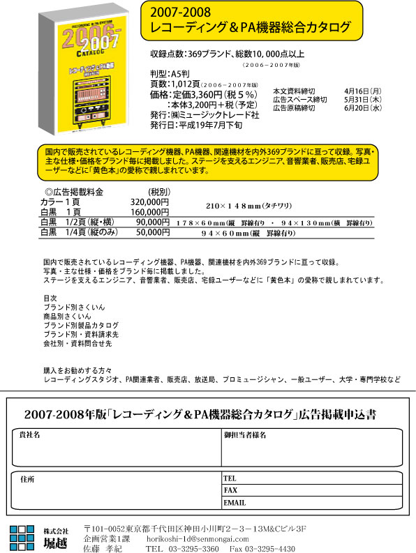 国内で販売されているレコーディング機器、PA機器、関連機材を内外369ブランドに亘って収録。写真・主な仕様・価格をブランド毎に掲載しました。 ステージを支えるエンジニア、音響業者、販売店、宅録ユーザーなどに「黄色本」の愛称で親しまれています。