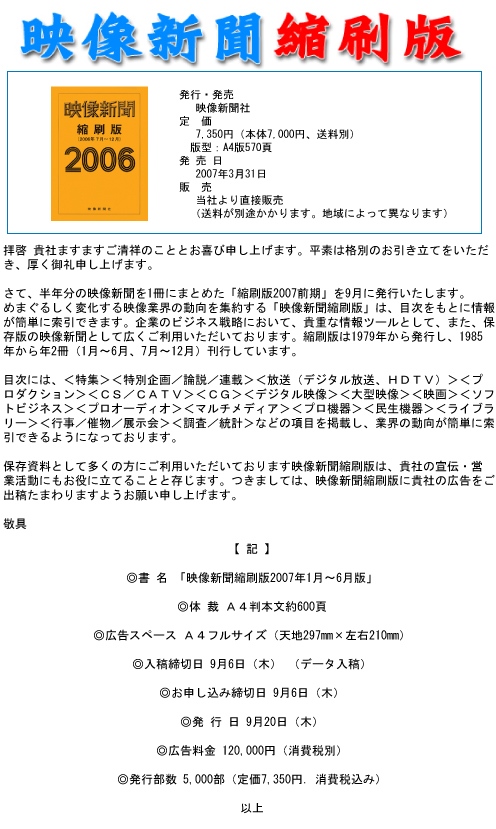 半年に一度発行しております「映像新聞 縮刷版」は今回、9月に発行いたします。広告企画書を送付させていただきますので、ご査収の上、ご検討いただければ幸いでございます。何卒よろしくお願いいたします。お申込・ご意見・ご質問は以下のフォームよりお願いします。http://my.formman.com/form/pc/ChJqy92ww17jYLjJ/