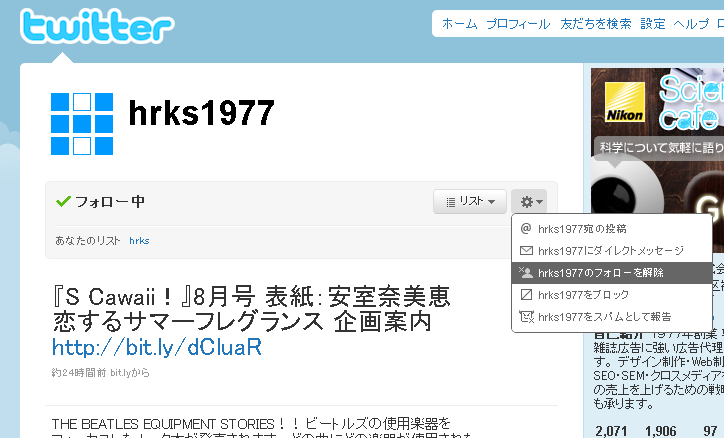 ちなみに、フォローを解除することもできて、右側の歯車のマーク